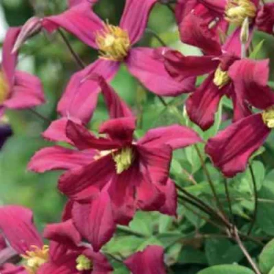 Цветки клематиса впечатляют своей необычной красотой. С диаметром от 10 до 13 см, карминовые соцветия с бархатистой текстурой выглядят особенно эффектно благодаря ярким желтым пыльникам. Каждый цветок состоит из 5-6 эллиптических, причудливо скрученных чашелистиков, что добавляет им уникальности и очарования.